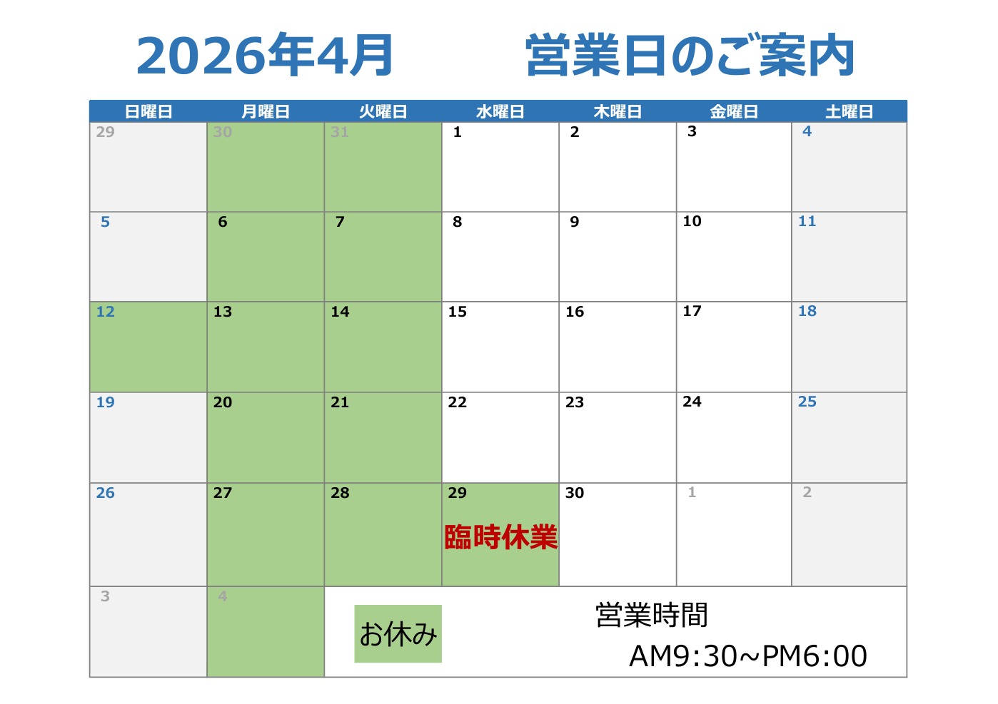 営業時間 9:30~18:00(受付終了)